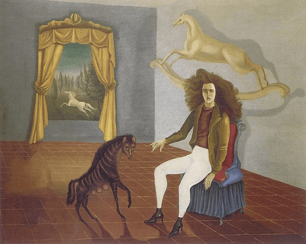 A fare da tramite tra questi due mondi sono quasi sempre degli animali, protagonisti continui delle sue storie e dei suoi quadri: ma anche loro finiscono ben presto per essere travolti da questo sovvertimento, cosicché è facile incontrare degli animali che assumono comportamenti umani ed esseri umani che sono assai più vicini ad atteggiamenti bestiali. Carrington era infatti convinta, e ne sono testimonianza anche i suoi quadri, che in ogni uomo ci sia una parte animale, nascosta ma che richiama attenzione: “Venga, cara signora, non si tormenti; tutti, fatalmente, presentiamo una certa somiglianza col genere animale; lei sarà di certo consapevole del suo aspetto cavallino”. Così viene detto alla protagonista del racconto “L’uomo neutro” dal signor MacFrolick, “porco devoto e distinto”. In particolare Carrington sembra avere una predilezione per due animali: le iene e i cavalli. Nel suo Autoritratto risalente agli anni Trenta, la pittrice si rappresenta in una stanza vuota, seduta su una vistosa poltrona azzurra e rossa e davanti a sé dipinge una iena, ritta sulle zampe posteriori con le mammelle bene in vista, sul muro un gigantesco cavallo a dondolo bianco e, fuori dalla finestra, un altro cavallo bianco che corre libero nel prato.