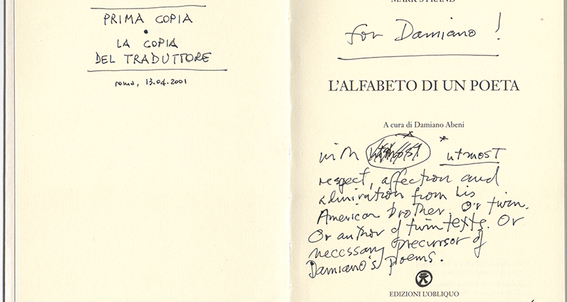Va riconosciuto che i traduttori si trovano spesso nella posizione di dover alzare il cartello “non sparate sul pianista”, dato che è fin troppo facile criticarli. Ma qui, mettendo da parte la modestia, mi sento a questo proposito di citare Mark Strand in difesa del mio approccio: “Sono stato tradotto in una ventina di lingue diverse, e ho fatto letture in 40-50 nazioni diverse”, mi ha detto una volta, “e ogni volta, a lettura finita, mi si avvicina qualcuno che dice sempre, più o meno, ‘Le sue poesie mi piacciono moltissimo, ma io le avrei potute tradurre meglio’. Questo non è mai successo in Italia”. E uno dei più graditi complimenti che abbia mai ricevuto mi è stato fatto da un ragazzino di 10 anni, figlio di amici anglofoni. Il ragazzo è nato in Italia, ed è perfettamente bilingue: dopo una lettura delle poesie di Moira e delle mie traduzioni – alla quale era stato trascinato dalla madre che si immaginava si sarebbe annoiato a morte – il ragazzo ha detto alla madre qualcosa come: “Damiano è molto bravo, perché non usa la stessa parola. Lui usa la parola giusta”.