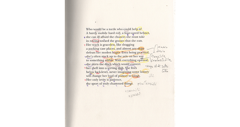 Prima guardo la poesia, senza leggerla. Mi limito a osservarla, come un oggetto concreto e animato, cercando di capire come è fatta. Non solo perché Wystan Hugh Auden ha detto all’Arcangelo Michele, mentre anche James Merrill e David Jackson presenziavano alla lezione, SIGNORI: / IL VERO POETA È, DI TUTTI GLI SCRIBI, IL PIÙ ATTRATTO / DAL CONCRETO. SÌ SIGNORI, NOI CE NE NUTRIAMO!, ma per via dell’etimologia stessa della parola “poeta” – ποιέω, io faccio: artefice, el hacedor borgesiano. La prima domanda che mi pongo è: “che meccanismi sono in atto qui, cosa sta facendo il poeta?”, non “cosa sta dicendo il poeta?”. Ogni parola, ogni sillaba, ogni lettera, ogni accento è importante, in se stesso e in relazione a ogni altra parola, sillaba, lettera, accento. Leopardi ha detto (e mi pare di ricordare che stesse citando Pindemonte, ma non citatemi a questo proposito): “le parole sono non la veste, ma il corpo dei pensieri”. Così tiro fuori il mio piccolo campionario di matite colorate, molto limitato rispetto a quello che ho a disposizione a casa, e comincio a dipingere la poesia: stesso colore per le lettere che risaltano in assonanza, consonanza, rima, rima imperfetta; linee che connettono aspetti uguali o simili, suoni uguali o simili… Cerco di ritrarre in modo visibile il ritmo, la musica della poesia. Questo strano stratagemma mi è venuto in mente un giorno che guardavo la copertina dell’antologia curata da Dylan Thomas, The Colour of Saying, il colore del dire…: se le parole, sulla pagina e quando pronunciate/enunciate, hanno un colore, dovremmo essere in grado di vederlo!