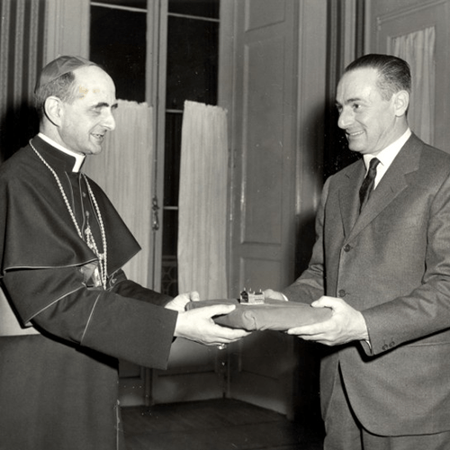 1956. Enrico Mattei consegna all'arcivescovo Montini il plastico della chiesa di Santa Barbara, che sarà poi costruita Metanopoli/Fondazione Enrico Mattei.