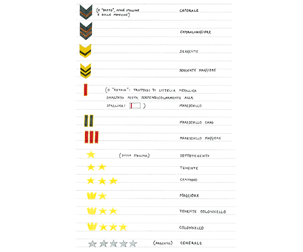 La cerimoniosità, la vuota ritualità, l’ordinamento gerarchico incontrano il fondo più regressivo e maniacale della filologica sensibilità di Mari. Il piacere con cui lo scrittore si diverte a decostruire le movenze dei soldati, a dissezionare una manovra militare o ad allestire, con un gusto quasi araldico, un dettagliato prospetto iconico delle insegne relative ai diversi gradi della gerarchia militare, questo piacere e quello di altri simili esercizi nomencaltorio-classificatori smettono l’abito umoristico per diventare espressione di una vera, di una autentica jouissance: “Di quell’anno dilapidato le formule, gli arcaismi, i decorativi cavilli, le pompe esteriori, i rituali arcani, sono l’unica luce, la sola passione”.