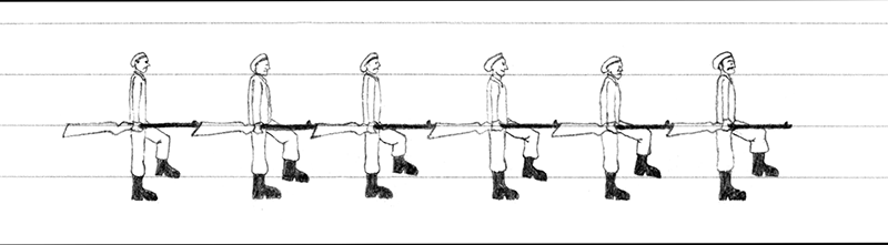Come non pensare, allora, che come quella teologica anche la tradizione militare abbia corteggiato l’assurdo, raffinando nei secoli una tecnica di designificazione delle cose proprio a marcare la propria alterità appo la vita normale? Perché non credere che questa enorme, flagrante demenza non celi una astuzia tignosa, che facendo del non-senso il proprio unico senso non consegua perfettamente il proprio fine, ciò è a dire perpetuarsi come una liturgia resasi pura forma, come un motivo ornamentale solutosi in mero ritmo?