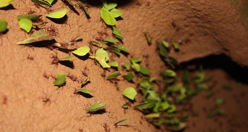 Le formiche tagliafoglie, che popolano una fascia di territorio tra Texas e Messico, costruiscono i propri nidi smuovendo fino a 40 tonnellate di terreno e realizzando un intricato ed efficientissimo sistema di cunicoli, stanze, gallerie, “cantine” con il giusto grado di umidità per la conservazione delle foglie tagliate (da cui si svilupperanno funghi, che poi costituiranno il principale nutrimento della colonia…una forma di agricoltura, insomma), sistemi di aerazione, uscite, entrate, comignoli. Fanno tutto questo senza seguire nessun progetto globale, senza nessuna struttura gerarchica, senza nessun direttore dei lavori che impartisce gli ordini, senza alcun supervisore. In maniera decentralizzata e auto-organizzata, appunto.